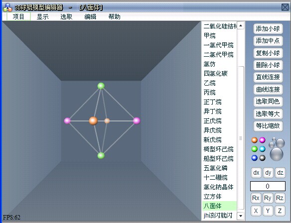 打开《3D球棍模型编辑器》后,程序自动加载列表中的第一个球棍模型,并按默认的[定向旋转]方式展示该模型。如果需要展示其他模型,只须点击列表框中相应的项目即可。如果需要使用其他的展示模式,可以从[显示]菜单项中选中相应的模式。在静止模式下,球棍模型静止不动,常用...