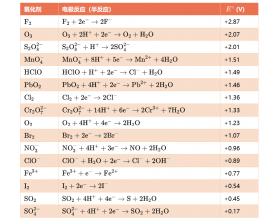 一、氧化剂标准电极电势从强到弱排序表 二、还原剂标准电极电势从强到弱排序表 三、关键说明 1.电极电势与氧化性或还原性: E Θ 值越大,氧化剂夺取电子的能力越强(如 F 2 >O 3 >Mn O 4 - ),E Θ 越小,还原剂失去电子的能力越强(如LiNaK) 正值的还原剂(如 Fe 2+ 、H...