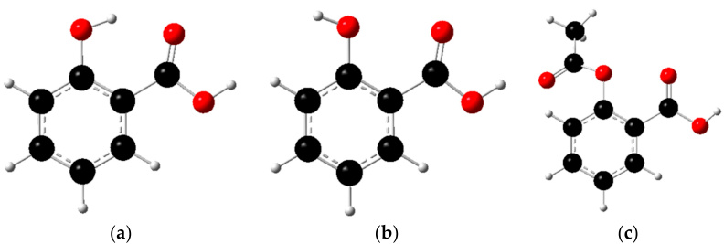 图2 (a、b)水杨酸的两种构象,其中a的苯酚OH和COOH形成分子内氢键,b不形成氢键(c)阿司匹林(乙酰水杨酸)不形成氢键
