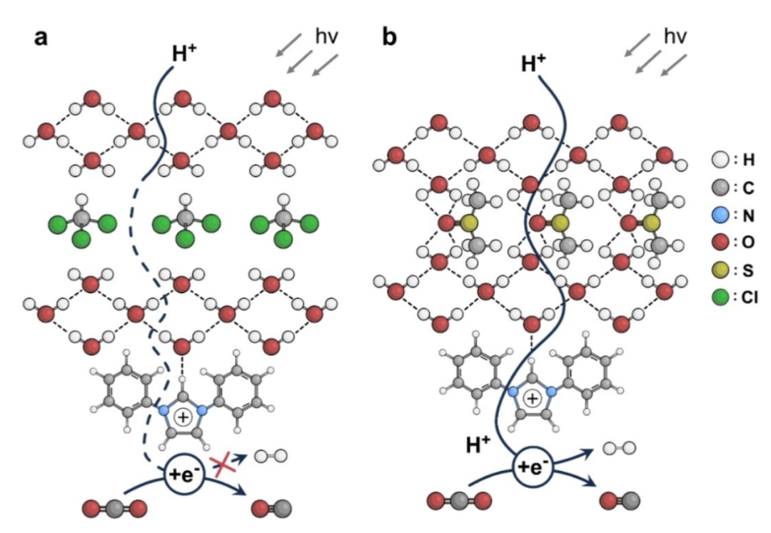 图14 在光催化CO2RR过程中,氢键网络对H2生成的影响。