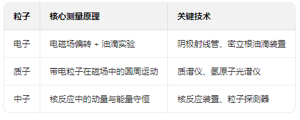电子、中子、质子的质量测量是贯穿经典物理到近代物理的重要实验成果,依赖不同时代的技术手段和物理原理,三者的测量方法差异显著。