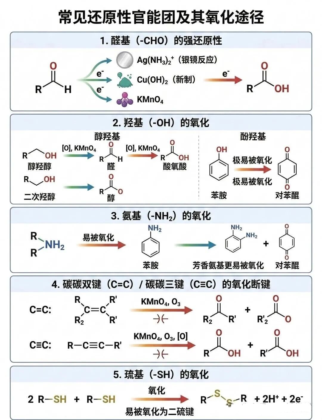 1.醛基 -CHO 强还原性,可被银氨溶液、新制 Cu (OH)₂、KMnO₄氧化,-CHO → -COOH