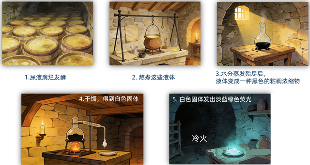 1669年,布兰德收集了大约五十桶人类尿液(据传主要来自士兵),将其放在地窖里腐烂发酵,然后开始没日没夜地熬煮。当水分蒸发殆尽,尿液变成一种黑色的粘稠浓缩物时,他用极高的温度在沙炉中对这种渣滓进行干馏。很遗憾,布兰德没有看到黄金,但他看到冷凝管的末端滴下了一种如同蜡状的白色固体。当地下室陷入黑暗时,这种物质竟然在没有任何热量的情况下,散发出幽幽的淡蓝绿色荧光。