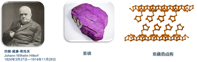 1865年,希托夫将红磷与铅一起放入一个密封的管子中,加热到惊人的550°C的高温,然后让其在极其缓慢的过程中冷却,过程大概持续数天甚至数周。在这个过程中,用铅作溶剂,让磷原子在其中重新排列。随后,用稀硝酸将铅溶解掉。留在试管底部的,不再是暗红色的粉末,而是一种闪耀着金属光泽的、紫黑色的单斜晶体:紫磷。