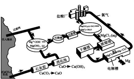 工业上提镁的一种方式是将海水抽入反应槽,加入石灰乳,使镁转换为Mg(OH)2沉淀,再加入盐酸转换为MgCl2溶液,蒸发溶液后,得到MgCl2·6H2O晶体,随后在HCl气流中脱水,得无水MgCl2,最后电解MgCl2得到Mg和Cl2,氯气可用来制盐酸,再循环利用。