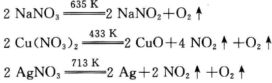 一般来说,活泼金属的硝酸盐,也就是金属活动性顺序表里钾、钙、钠的硝酸盐,受热时放出氧气并生成相应的亚硝酸盐;在 金属活动顺序表中位于镁和铜之间的金属硝酸盐受热时,生成金属氧化物、二氧化氮和氧气;而铜以后的金属硝酸盐受热时,生成金属单质、二氧化氮和氧气。这个规律可表示如下: