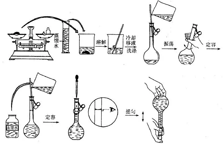 ③溶解:将固体或液体溶质倒入烧杯中,加入适量的蒸馏水(约为所配溶液体积的1/6),用玻璃棒搅拌使之溶解。