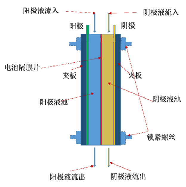 液流电池的单个电池的内部构造大体如图: