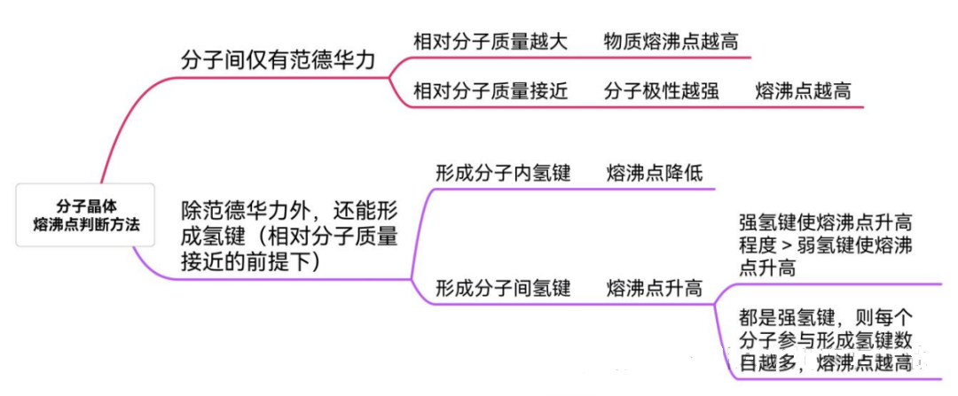①结构相似,摩尔质量接近的物质(CH4、NH3、H2O、HF),若能形成分子间氢键,则能使物质的熔沸点升高(在摩尔质量接近的前提下,氢键比范德华力强);分子间能形成强氢键的物质熔沸点高于形成弱氢键的物质;若都能形成强氢键,则分子间氢键数目越多,熔沸点越高。