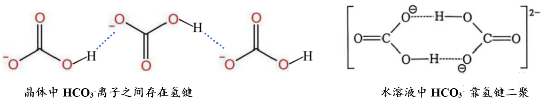 常温下碳酸氢钠(NaHCO3)溶解度远低于碳酸钠(Na2CO3)的溶解度,这也是因为在NaHCO3晶体中存在大量氢键将HCO3-缔合,不利于其溶解。即便是溶于水后相当部分碳酸氢根也会在水溶液中通过氢键二聚,这在一定程度上阻碍了它的分散,不利于其溶解。