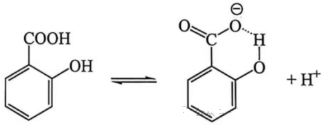 依据pKa的数值,上图三种酸的强弱排序:邻羟基苯甲酸>间羟基苯甲酸>对羟基苯甲酸。我们思考一下氢键在其中的影响。如图所示,邻羟基苯甲酸在电离出一个H+后,羧基暴露出的带电荷的O 与羟基的H形成了一个分子内氢键,整个分子除了苯环以外又形成一个环(六元环),这样的结构能量低、比较稳定,相应的就容易生成,因此邻羟基苯甲酸就容易电离出一个氢离子,体现出的酸性就比间羟基苯甲酸和对羟基苯甲酸强很多。