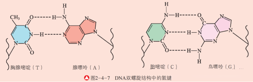 DNA 分子有两条链,链内原子之间以很强的共价键结合,链之间则是通过两条链上的碱基以氢键为主要的相互作用维系在一起,两条链在许多的氢键及其他相互作用下形成独特的双螺旋结构,这是遗传基因复制机理的化学基础。