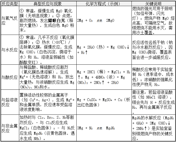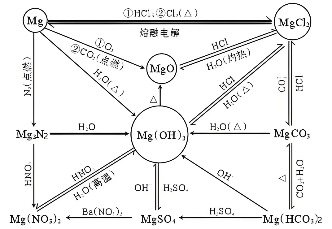 掌握以下转化路径,可快速理解镁的化学性质关联:Mg(单质)→ MgO(燃烧 / 与氧反应)→ Mg (OH)₂(与热水反应 / MgO 与水缓慢反应)→ 镁盐(与酸反应,如 MgCl₂、MgSO₄、MgCO₃)反向转化: