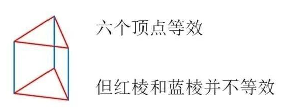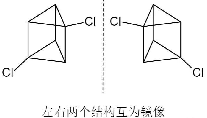 棱晶烷的六个顶点是完全一样的,因此棱晶烷的一氯代物只有一种;但它的九条棱并不完全一样,直观的看,任何一条蓝棱都与其他棱垂直或平行,但红棱并不具备这样的性质。因此二氯代物就有三种或四种:(1)同一条红棱上;(2)同一条蓝棱上;(3)不在同一条棱上(如果考虑立体异构是两种)。