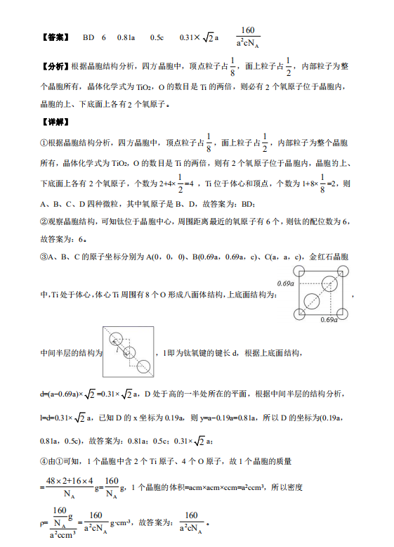 ③若A、B、C的原子坐标分别为A(0,0,0)、B(0.69a,0.69a,c)、C(a,a,c),则D的原子坐标为D(0.19a,____,___);钛氧键的键长d=______(用代数式表示)。
