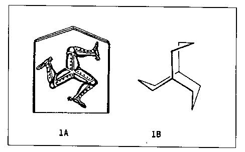 合成化学家们在实验室中创造了许多构造特殊的分子,常以和它们形状相似的特殊体来命名,表现出化学家们幽默的一面。译注:不少的合成化学家们像堆积木的儿童,在实验室中创造出许多形状奇特的分子。这些「人造」分子往往有重要的、特殊的化学性质可以被化学家们利用。就理论的观点看,各种异常构造也是对化学键结的一种考验,使化学家们对化学键有更深一层了解。合成化学家们在有异味的实验中日夜煎熬之余,尚能苦中作乐,将成品以相似形状的物体命名。萌岛徽章图案在爱尔兰海中心,有一小岛叫萌岛(Man,现为英属地),为英伦三岛包围,这个小岛有一种官方徽章,图案是三条武士的腿(1A)。1970年,英国的帕克尔(W.Parker)发表新的有机化合物(1B),此分子含11个碳,由于这个化合物的构造与萌岛的徽章图案非常相似,所以决定把它命名为manxane